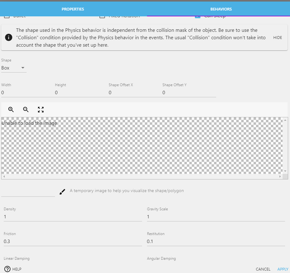 Additionally, objects with the Physics behavior ignore the object's Collision Masks and instead use the collision information on the BEHAVIORS tab of the object itself. This defaults to a box that is the full dimension of the object. In most cases, there will be a need to change these settings from within the BEHAVIORS tab.