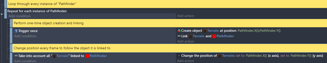 In this example, for every existing "Pathfinder" object, a new "Terrain" object is created. This creation and linking step only needs to be performed one time. The bottom event is run every frame and will cause the "Terrain" objects to always follow the "Pathfinder" object they are linked to.