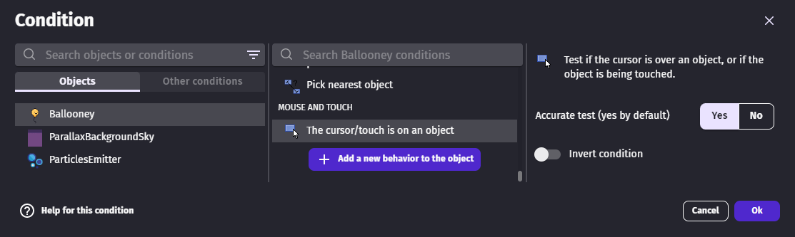 "The cursor/touch is on an object" condition checks if the mouse cursor or a screen touch is over an object.