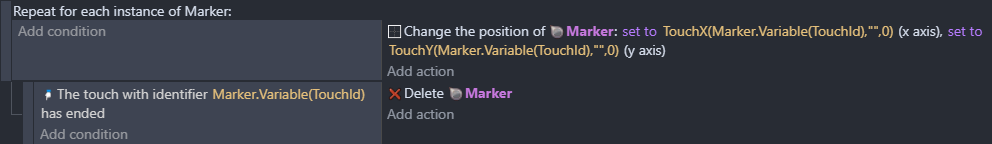 • When the touch moves, the touch identifier is needed to make sure to follow the right touch. A variable can be used to ensure this.