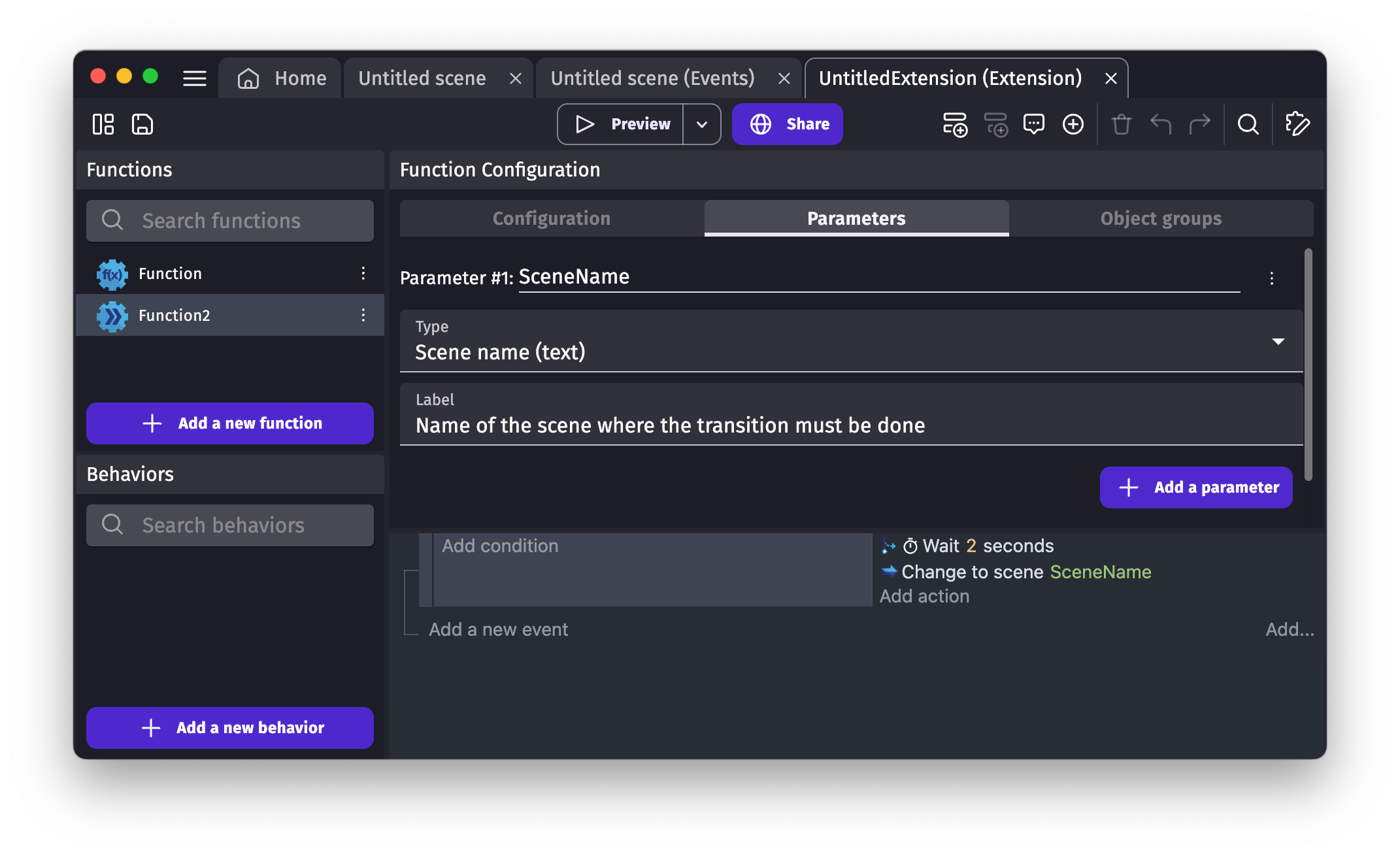 Similarly to scenes or external events, functions are written with events. They allow to create new conditions, new actions and new expressions that add up to GDevelop features. They are a good way to organize events, avoid duplication and share features with the community.