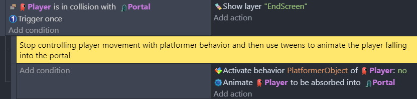 The platformer template has a Player extension with a few functions. For instance, the function AnimateFallingIntoPortal uses a few actions to make an animation that is played at the end of the level.