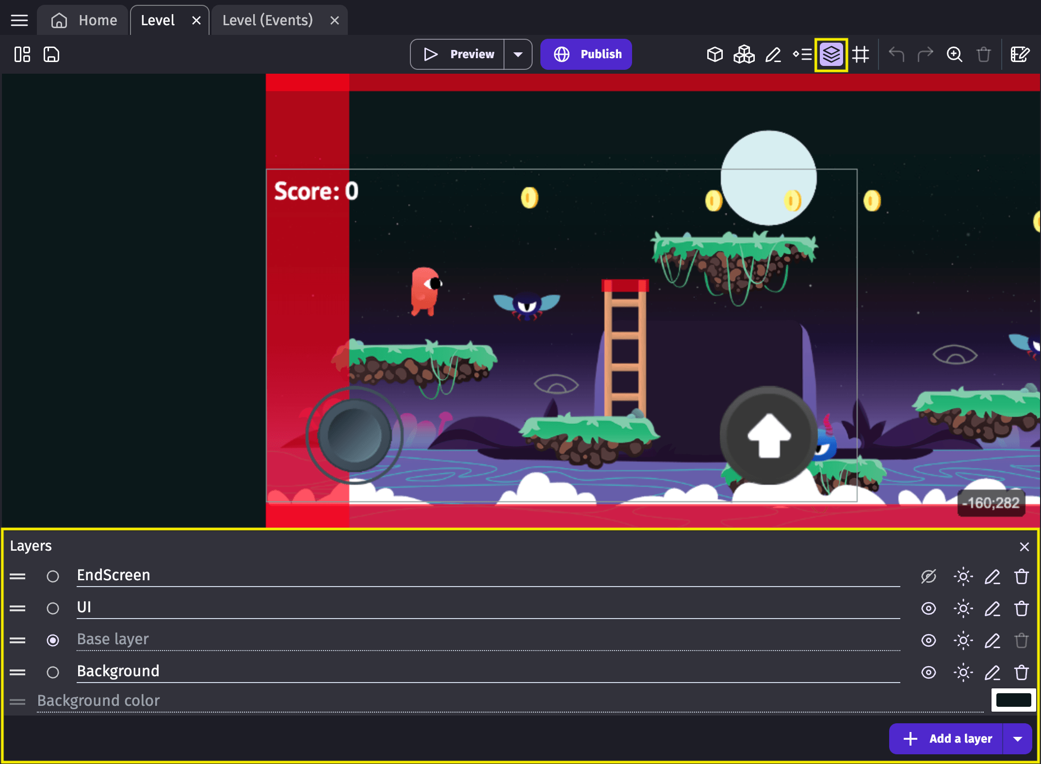 A layer acts as a virtual container for objects displayed on the screen. By default, objects are drawn on the “base layer”, but scenes can have multiple layers. For example, it is common for a "UI" layer to display controls and text, while another layer could be used for the background.