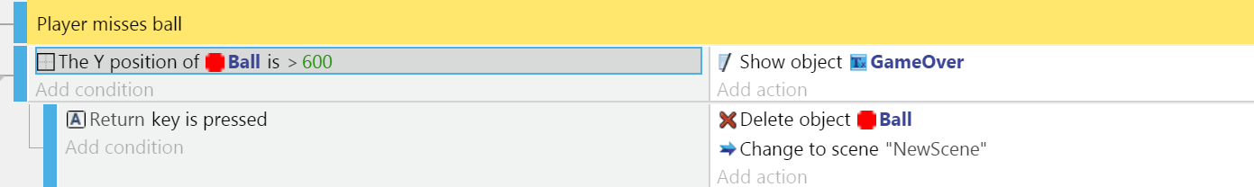 Add a corresponding action to make the GameOver object visible. You should also add a sub-event that causes the ball to be deleted and the game to restart if the player presses Enter. Add them now.