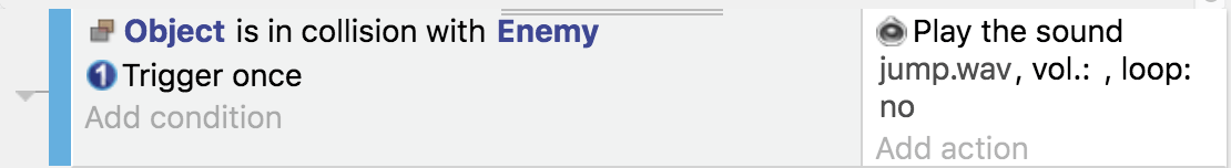 Once the parameter is set up, we can now use it as an object in the events. As an example, we will make the enemies play a sound when the player is colliding with them.