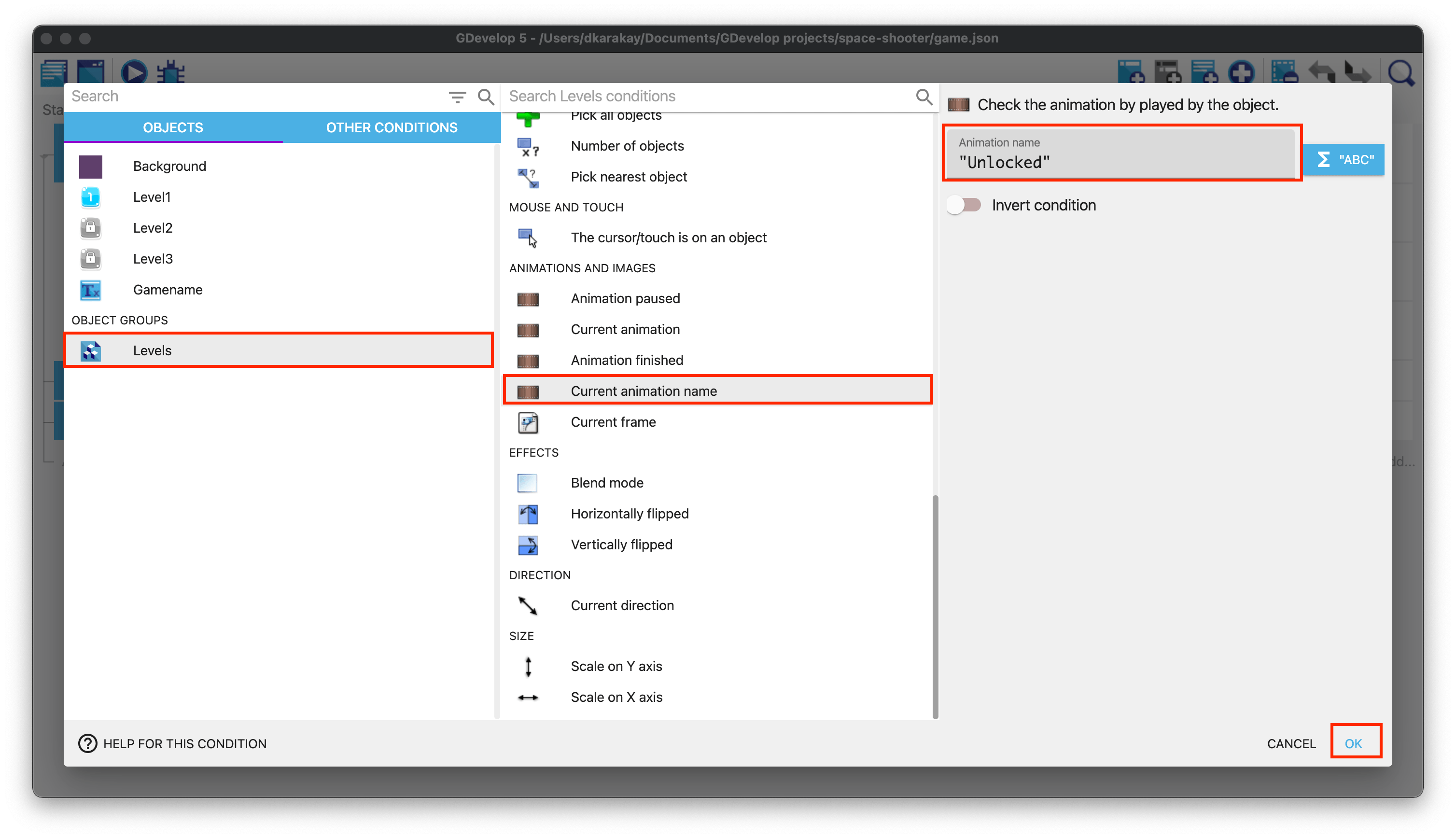 Add a new condition under the previous one to detect if the levels are unlocked or not. Select Levels object group, choose Current animation name option and enter Unlocked in the name field. Hence, we are preventing any problems regarding playing locked levels.